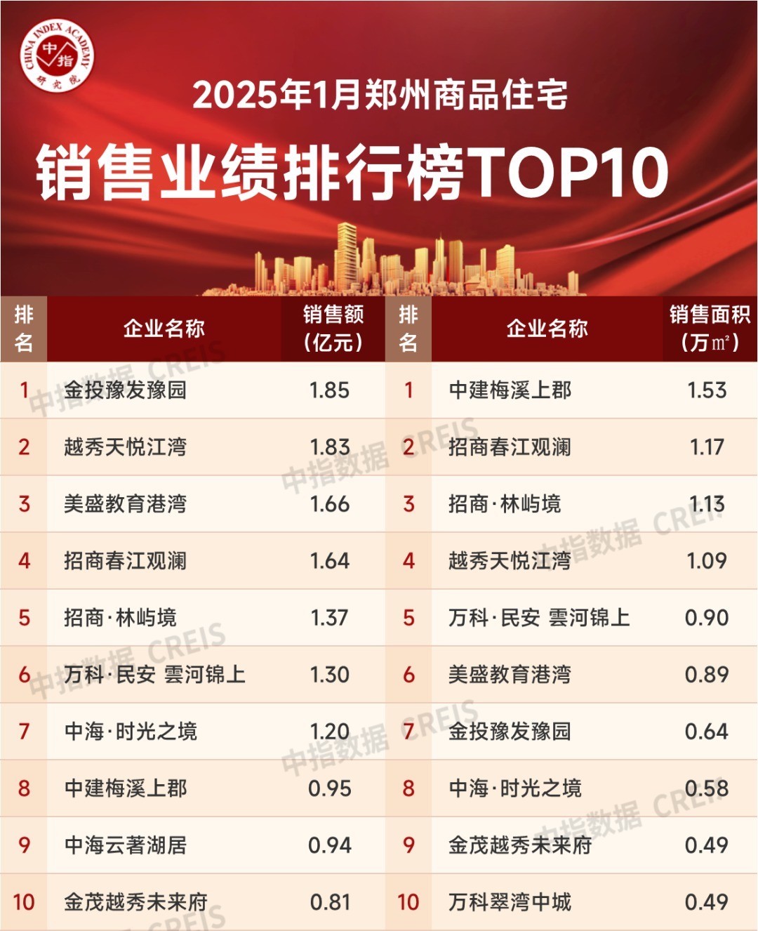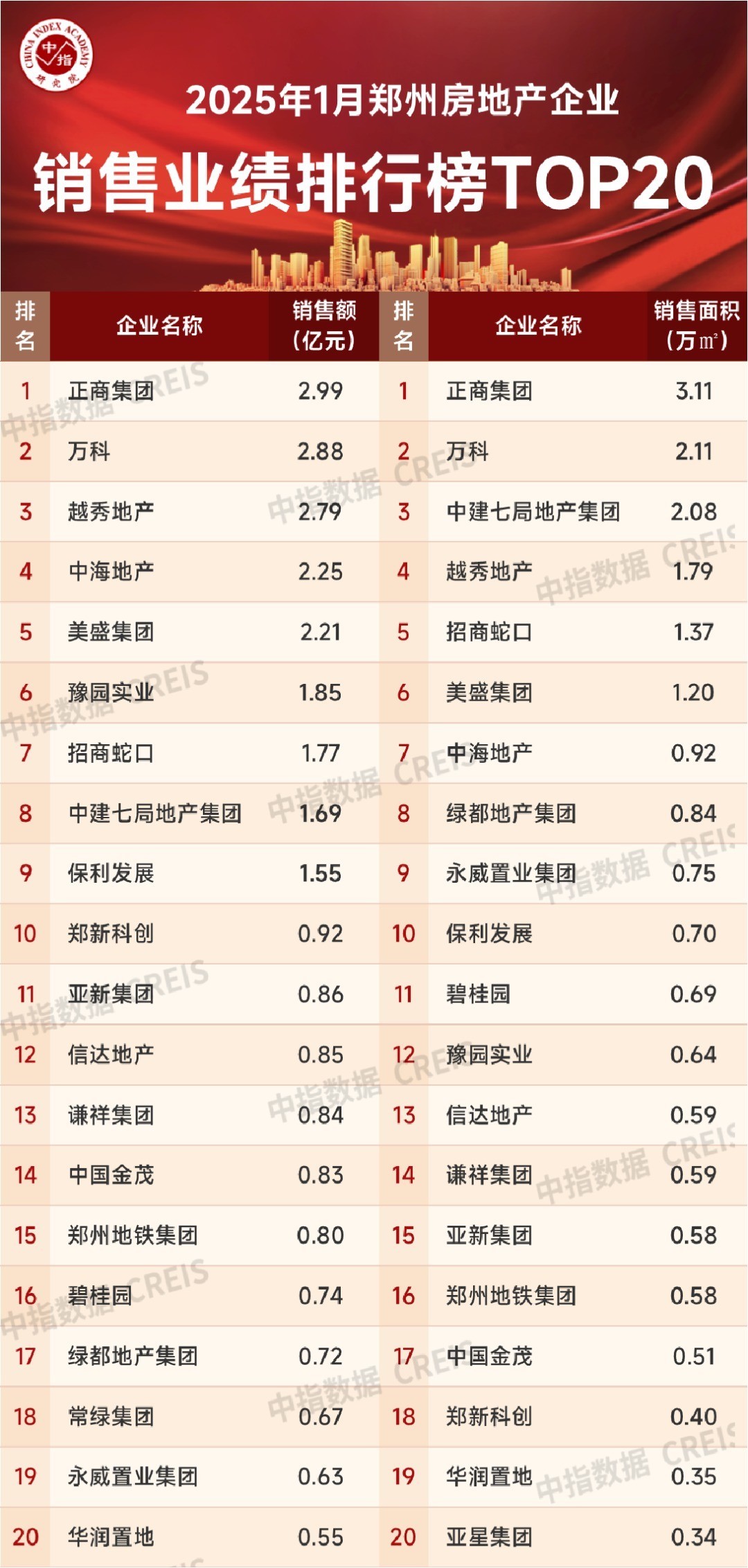 【大河财立方消息】2月7日,中指研究院发布2025年1月郑州房地产企业销售业绩TOP20。